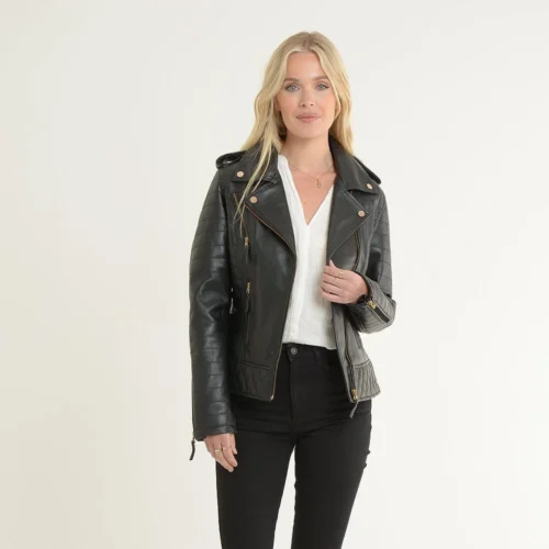 Handcrafted modern black biker in a soft buttery leather. With its simple clean lines, biker detailing, timeless styling, complete with a hand rubbed finish. The Casey ladies leather jacket is a must have for any woman looking for a wearable modern biker style jacket which can be worn with any type of apparel.