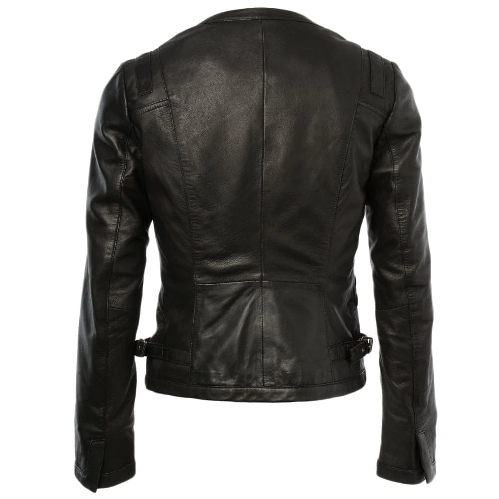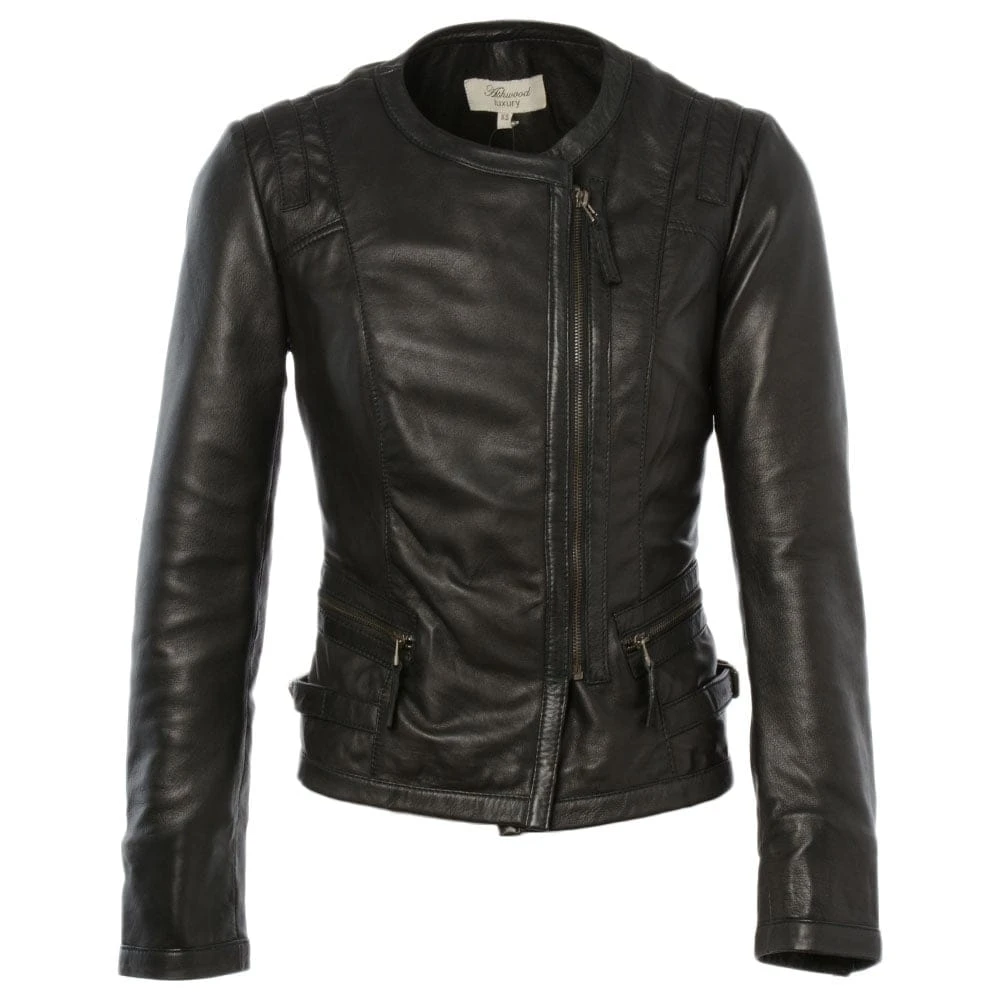 Expect a timeless design and quality craftsmanship for this collarless biker jacket. Comes in a choice of smooth black or the vintage wash and hand waxed effect coloured in brown or bone. Clean lines, attention to detail intricate applique leather on leather trim detail styling running along the front and around base of the neckline. Beautifully crafted leather, structured and elegant cut.
