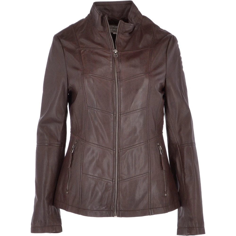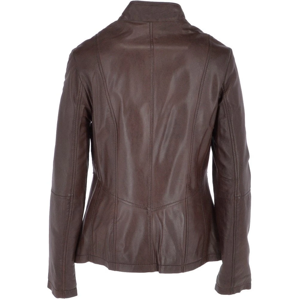 Leather craftsmanship from UK based Ashwoods design team at its best introducing a fusion of modern with practicality once more. With the choice of the smooth black finish or the vintage wash and hand waxed effect in the red or grey finish. Beautifully crafted leather, structured and elegant cut with fine stitching leather piping. Finished off with a perfect Nehru style collar stand. Details not found on any ladies leather jackets of this kind. Pleased to have it amongst Leather Company’s catalogue and collection.