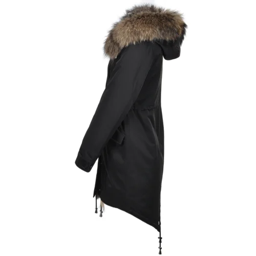 Hooded Toscana Tipped Fur Parka With Detachable Fur Trim Lining Black/white : Kaylee