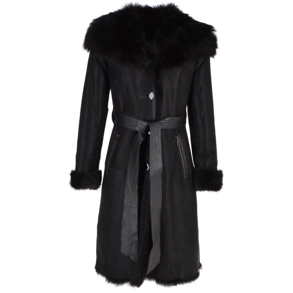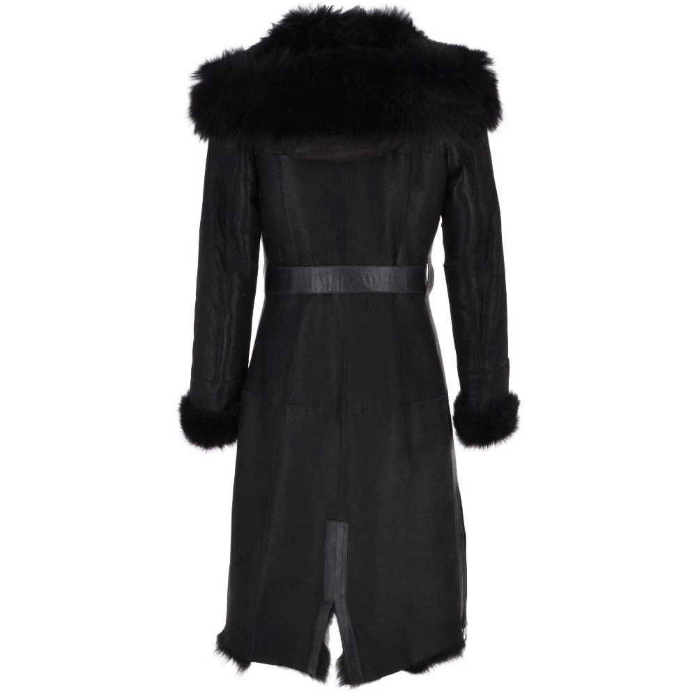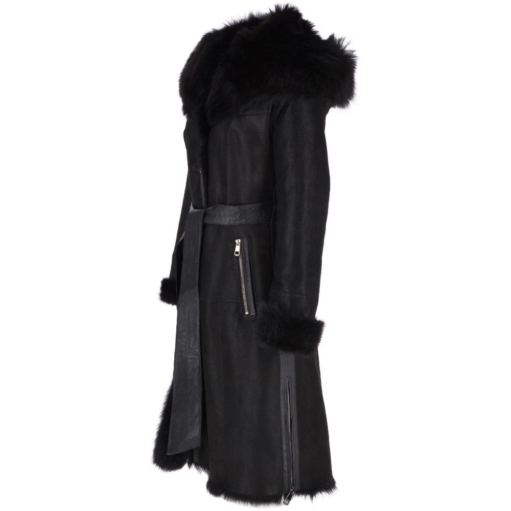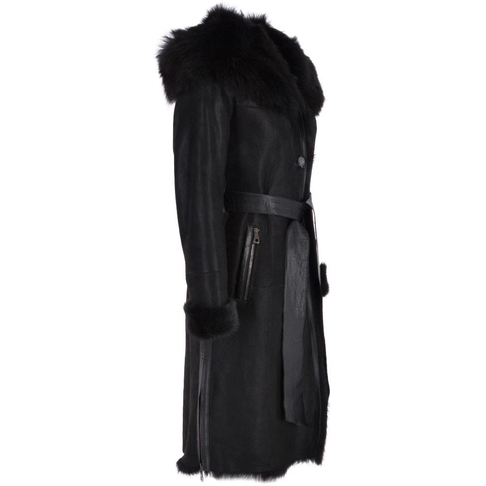 Toscana Longhaired Hood And Belted Shearling Coat Black : Cammi