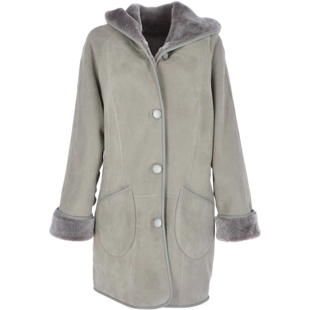 A beautiful luxury hand buffed hooded sheepskin coat, coloured in grey. Expertly constructed and tailored to last years with 100% sumptuous shearling. This coat is ideal when the cold winter months roll around, promising luxurious warmth and style that will last for years to come.